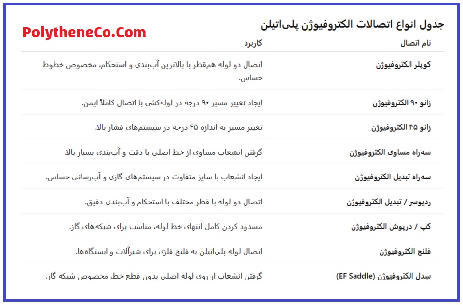 | کوپلر الکتروفیوژن (Electrofusion Coupler) | 20 تا 315 | PE100 | PN10–PN16 | اتصال مستقیم دو لوله | موجود / تماس بگیرید |